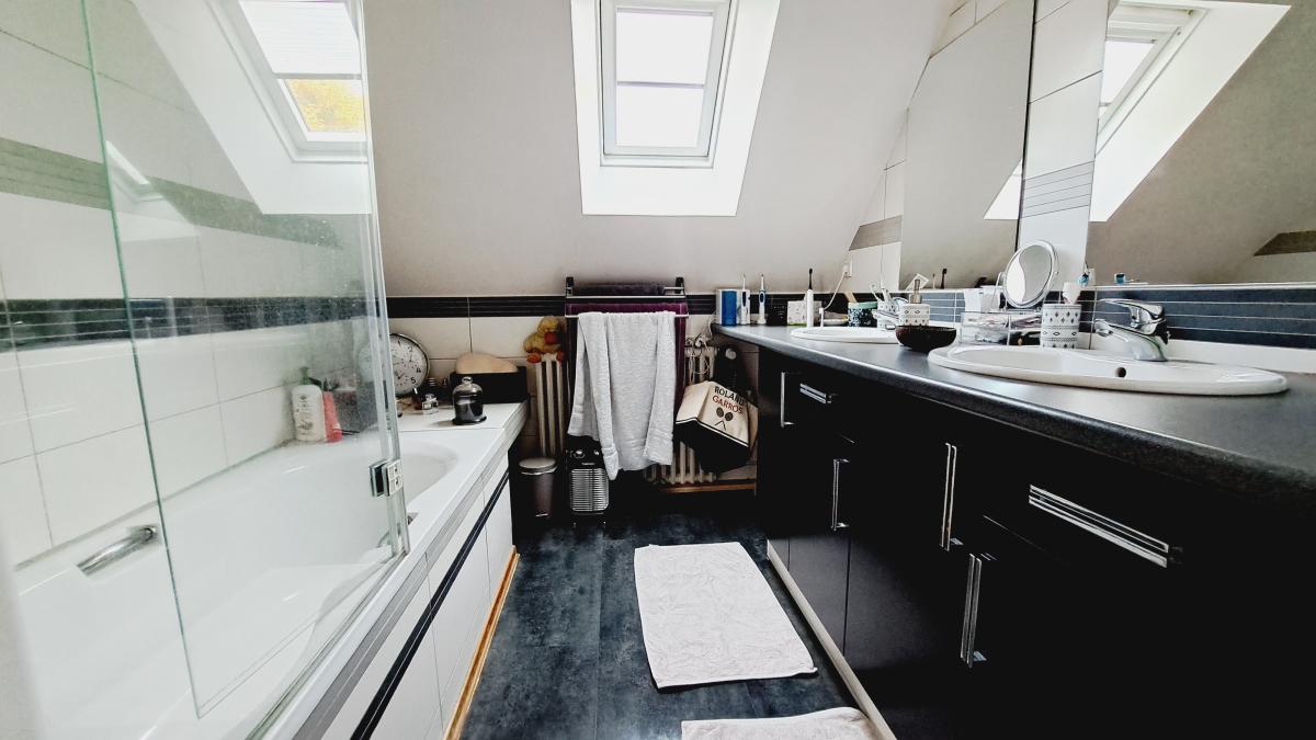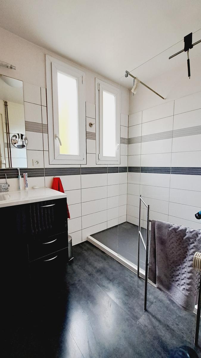 A l'étage, vous disposerez de deux belles chambres, une salle de douche , wc séparés ainsi qu'un espace buanderie .